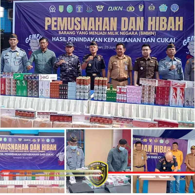 Burkas top —TEMBILAHAN -Kantor Pengawasan dan Pelayanan Bea dan Cukai Tipe Madya Pabean (KPPBC TMP) C Tembilahan menggelar pemusnahan barang yang menjadi milik negara dan hibah speedboat hasil penindakan kepabeanan dan cukai, di halaman kantor Bea-cukai Tembilahan, Selasa (25/6/24).