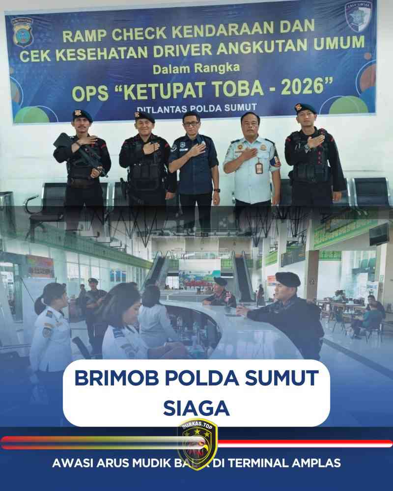 BURKAS.TOP, MEDAN | – Dalam rangka memberikan pelayanan dan memastikan keamanan masyarakat pada momentum arus mudik dan balik Hari Raya Idul Fitri 1447 Hijriah, personel Satuan Brimob Polda Sumatera Utara yang tergabung dalam Operasi Kepolisian Terpusat Ketupat Toba 2026 melaksanakan pemantauan di Terminal Bus Amplas, Kota Medan, Selasa (24/3/2026).