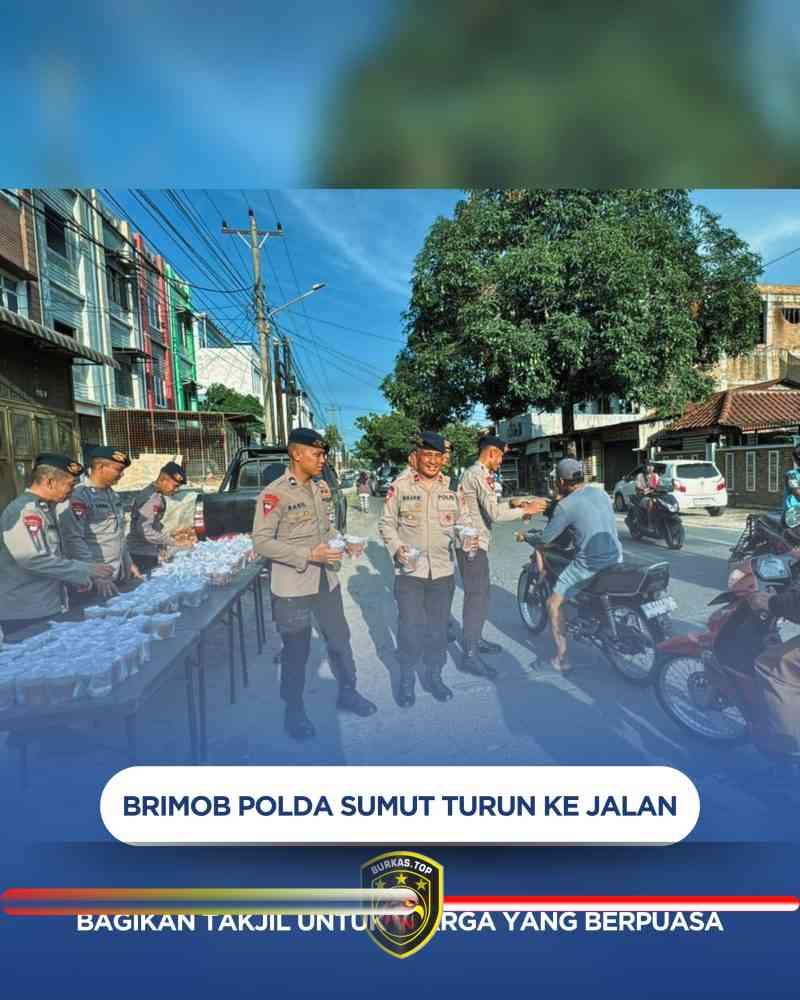 BURKAS.TOP, MEDAN | – Dalam semangat berbagi di bulan suci Ramadhan 1447 Hijriah, personel Kompi 3 Batalyon A Satuan Brimob Polda Sumatera Utara melaksanakan kegiatan pembagian takjil kepada masyarakat di Jl. Surya, Kelurahan Indra Kasih, Kecamatan Medan Tembung, Kota Medan, Senin (16/3/2026).