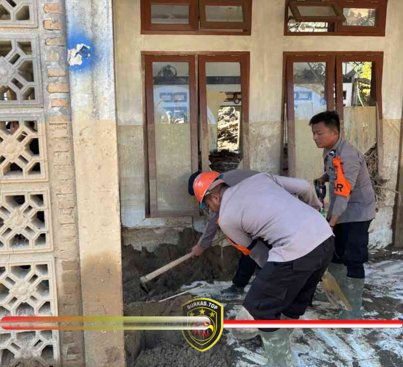Personel Brimob turun ke lokasi-lokasi yang terendam lumpur, membantu membersihkan masjid dan rumah-rumah warga.