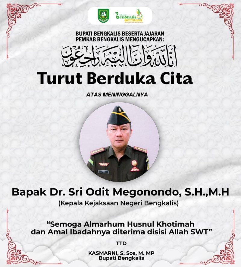 “Innalillahi wa inna ilaihi raji’un. Dengan penuh rasa duka cita, kami menyampaikan kabar bahwa Bapak Dr. Sri Odit Megonondo, Kepala Kejaksaan Negeri Bengkalis, telah berpulang ke Rahmatullah pada hari ini di Semarang, Jawa Tengah. Atas nama pribadi, keluarga, dan Pemerintah Kabupaten Bengkalis, saya menyampaikan belasungkawa dan duka cita sedalam-dalamnya kepada keluarga besar almarhum dan seluruh jajaran Kejaksaan Negeri Bengkalis,” ujar Kasmarni.