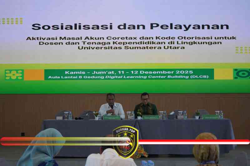 BURKAS.TOP, MEDAN | — Kantor Wilayah Direktorat Jenderal Pajak (DJP) Sumatera Utara I bekerja sama dengan Universitas Sumatera Utara (USU) menyelenggarakan kegiatan sosialisasi dan asistensi aktivasi akun Coretax bagi sivitas akademika. Kegiatan ini berlangsung selama dua hari, dari Kamis hingga Jumat, 11–12 Desember 2025, bertempat di Gedung Digital Learning Center dan Gedung Biro Rektorat USU, Medan.