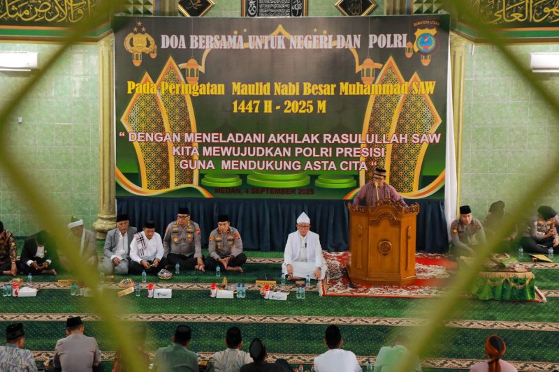 BURKAS.TOP, MEDAN |- Suasana khidmat menyelimuti Masjid Al-Hidayah Polda Sumut pada Kamis (4/9/2025), saat jajaran kepolisian bersama tokoh agama dan masyarakat menggelar Doa Bersama Untuk Negeri dan Polri dalam rangka memperingati Maulid Nabi Besar Muhammad SAW 1447 H.