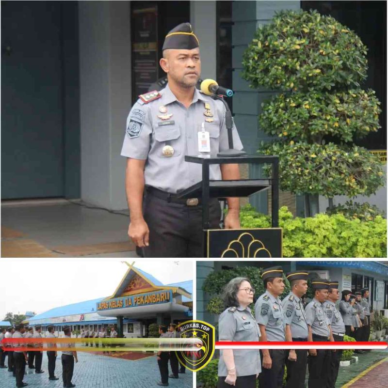 Burkas top –Pekanbaru, – Hujan gerimis yang mengguyur pada Senin (13/01) pagi, tidak menyurutkan semangat pegawai Lembaga Pemasyarakatan (Lapas) Kelas IIA Pekanbaru dalam melaksanakan apel pagi dengan penuh khidmat. Apel pagi rutin merupakan media bagi pimpinan untuk memberikan instruksi, apresiasi hingga evaluasi tugas dan fungsi sebagai Petugas Pemasyarakatan dan wejangan diluar tugas dan fungsi sebagai Aparatur Sipil Negara (ASN).