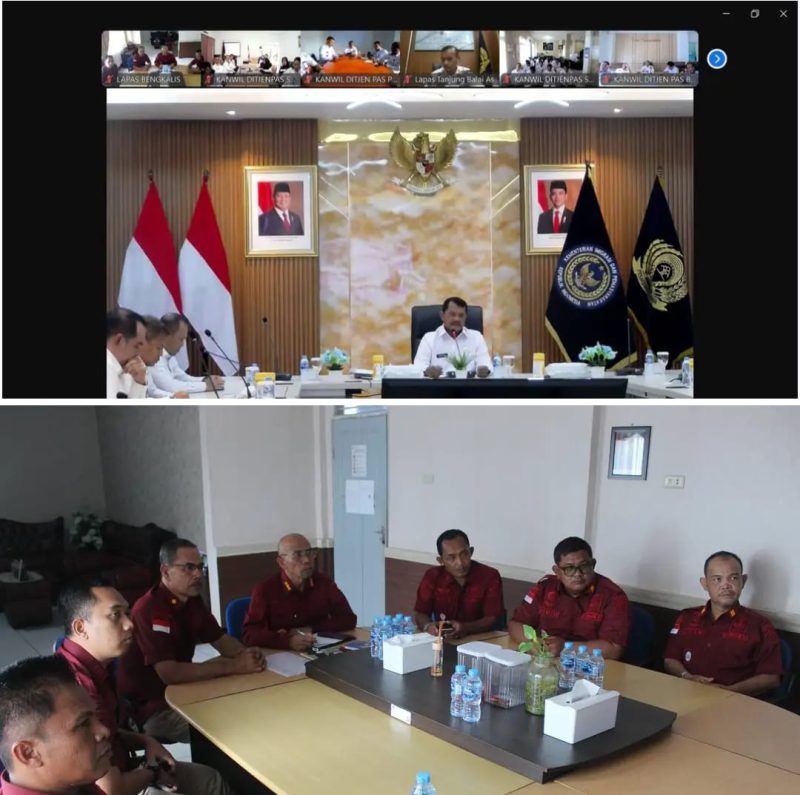 Lembaga Pemasyarakatan Kelas IIA Bengkalis ikuti rapat virtual yang dipimpin oleh Direktur Jenderal Pemasyarakatan (Dirjenpas) Mashudi. Rapat ini diikuti oleh Kalapas beserta jajaran pejabat struktural di ruang Rapat Kalapas Bengkalis.