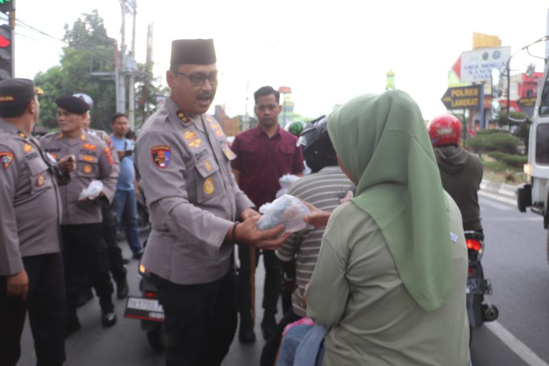 BURKAS.TOP, LANGKAT -| Kapolres Langkat, AKBP David Triyo Prasojo, SH, SIK, MSi, membagikan takjil untuk berbuka puasa bagi pengguna jalan yang melintasi Di Jalan Medan Banda Aceh, Rabu (12/3/2025) sore.