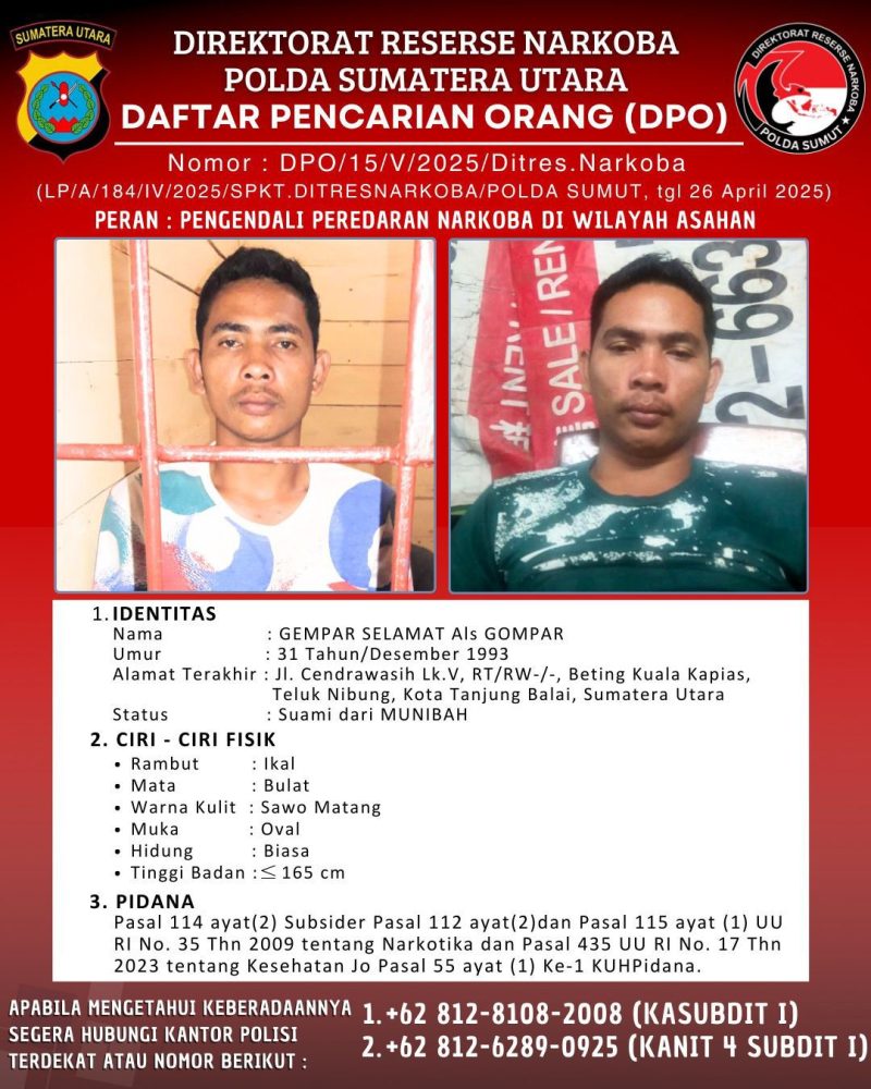BURKAS.TOP, MEDAN |– Direktorat Reserse Narkoba (Ditresnarkoba) Polda Sumatera Utara menetapkan Gempar Selamat alias Gompar sebagai tersangka dalam kasus tindak pidana narkotika dan sediaan farmasi ilegal, setelah terungkap peranannya dalam peredaran barang haram dalam jumlah besar.