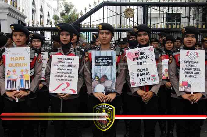 Sejumlah personel Polisi Wanita (Polwan) tampak berjaga sambil memegang poster kecil berisi ucapan selamat Hari Buruh 2025, sebagai simbol penghormatan dan empati terhadap perjuangan para pekerja.