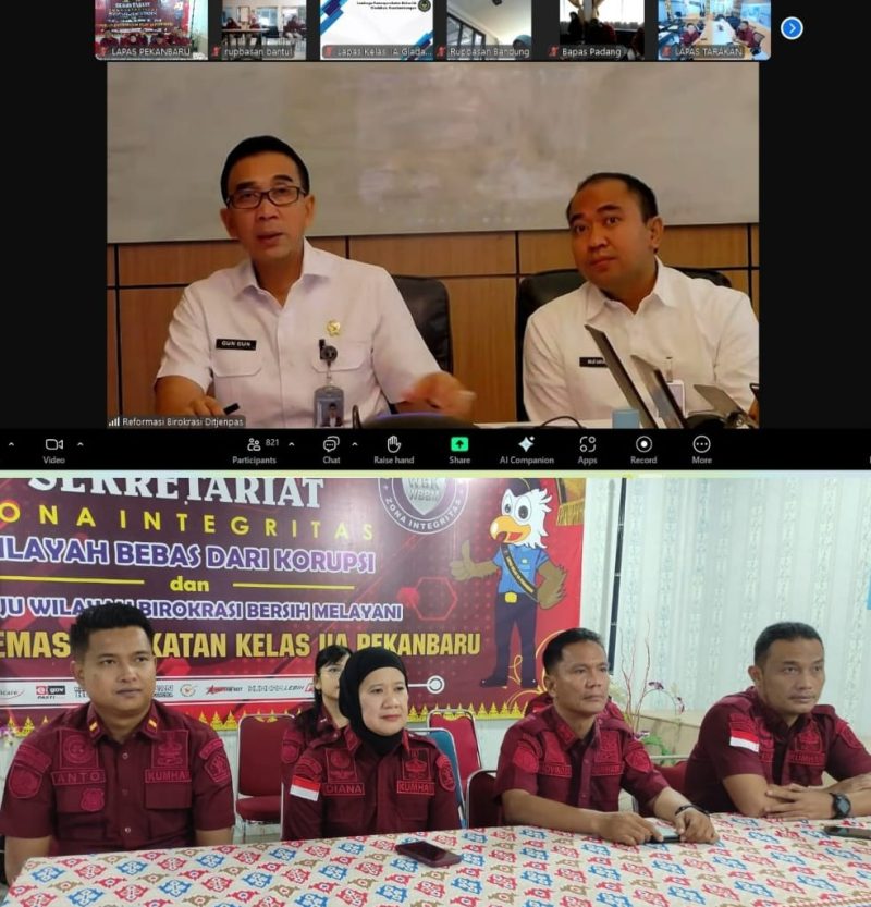 Burkas top –Pekanbaru– Lembaga Pemasyarakatan (Lapas) Kelas IIA Pekanbaru mengikuti Zoom Meeting terkait Pengumpulan Data Dukung Rencana Kerja Tahunan (RKT) Reformasi Birokrasi (RB) Triwulan I Tahun 2025 di Lingkungan Direktorat Jenderal Pemasyarakatan (Ditjenpas). Kegiatan ini berlangsung di Ruang WBBM Lapas Pekanbaru dan diikuti oleh Pejabat Struktural serta Tim Program Kerja Pembangunan Zona Intergritas (ZI) Lapas Pekanbaru, Kamis (06/03).