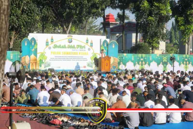 BURKAS.TOP, MEDAN | – Kepolisian Daerah Sumatera Utara (Polda Sumut) menggelar Shalat Idul Fitri 1447 Hijriah/2026 Masehi dengan khidmat di lingkungan Mapolda Sumut sebagai momentum memperkuat keimanan, ketakwaan, serta profesionalisme dalam mendukung transformasi Polri yang presisi untuk masyarakat.
