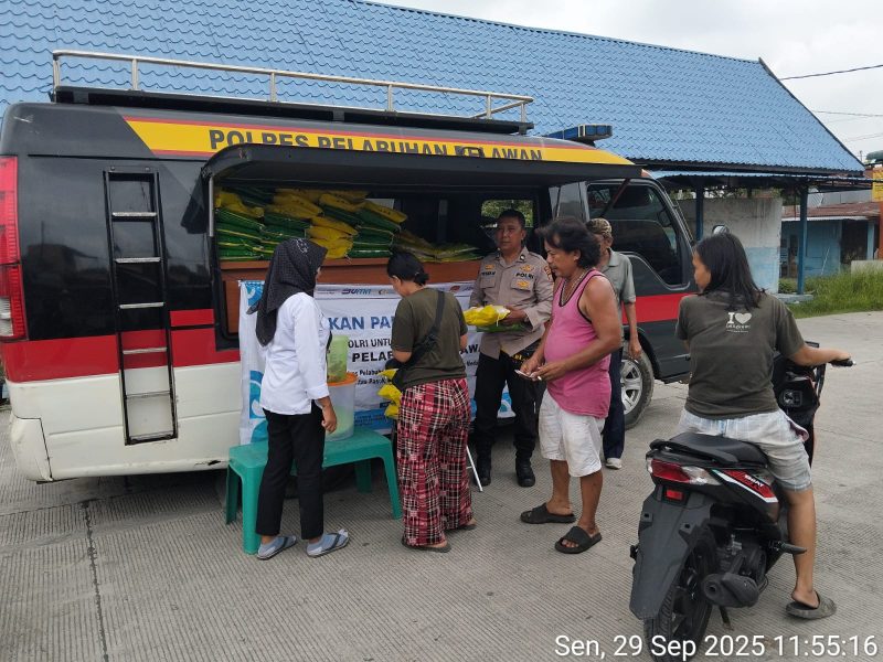 BURKAS.TOP, BELAWAN | – Polres Pelabuhan Belawan pada Senin, 29 September 2025 melaksanakan kegiatan Gerakan Pangan Murah Polri dengan menjual beras SPHP dari Bulog kepada warga di Jalan Selebes, Kelurahan Belawan II. Kegiatan ini disambut antusias masyarakat yang berbondong-bondong membeli beras berkualitas baik dengan harga terjangkau.