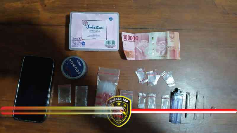 Petugas kemudian menghubungi kepala lingkungan setempat untuk mendampingi proses penggeledahan di sekitar TKP. Dari hasil penggeledahan, ditemukan sejumlah barang bukti yang cukup mencengangkan. Sabu-sabu seberat bruto 1,58 gram disembunyikan dengan rapi di dalam tempat minyak rambut Gatsby Pomade berwarna biru, terbungkus tisu dan dimasukkan ke dalam tiga plastik klip kecil. Selain itu, petugas juga mengamankan satu kotak plastik yang di dalamnya terdapat berbagai alat isap narkoba, seperti kaca pirex, sekop dari pipet plastik, jarum, kompeng dari pipet plastik, tujuh plastik klip kosong, uang tunai Rp100.000, sebuah mancis berwarna biru, serta satu unit ponsel iPhone 13 berwarna biru.