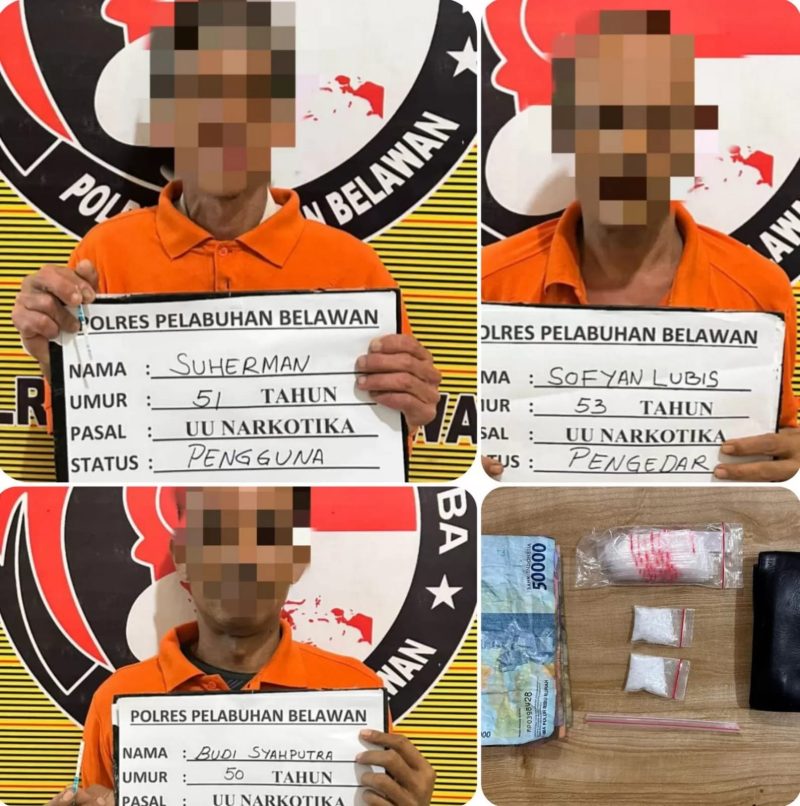 Ketiga pelaku yang diamankan adalah Sofyan (53) yang diduga sebagai pengedar, serta dua pengguna masing-masing Budi (50) dan Suherman (51). Dari lokasi penangkapan, petugas menyita sejumlah barang bukti berupa dua plastik klip sedang berisi shabu, satu bungkus plastik klip kosong, satu pipet ujung runcing, satu dompet hitam, dan uang tunai sebesar Rp. 85.000,-.