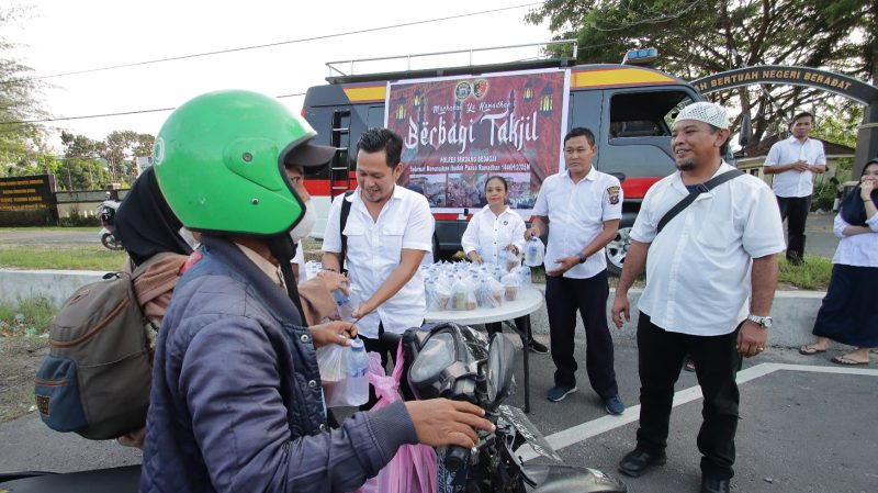 Kegiatan ini dipimpin langsung oleh AKP Doni P. Simatupang bersama personel Sat Reskrim Polres Sergai. Sebanyak 100 bungkus takjil, yang terdiri dari kue, kurma, air mineral, dan bubur, dibagikan kepada para pengendara yang melintas di depan Mako Polres Sergai.