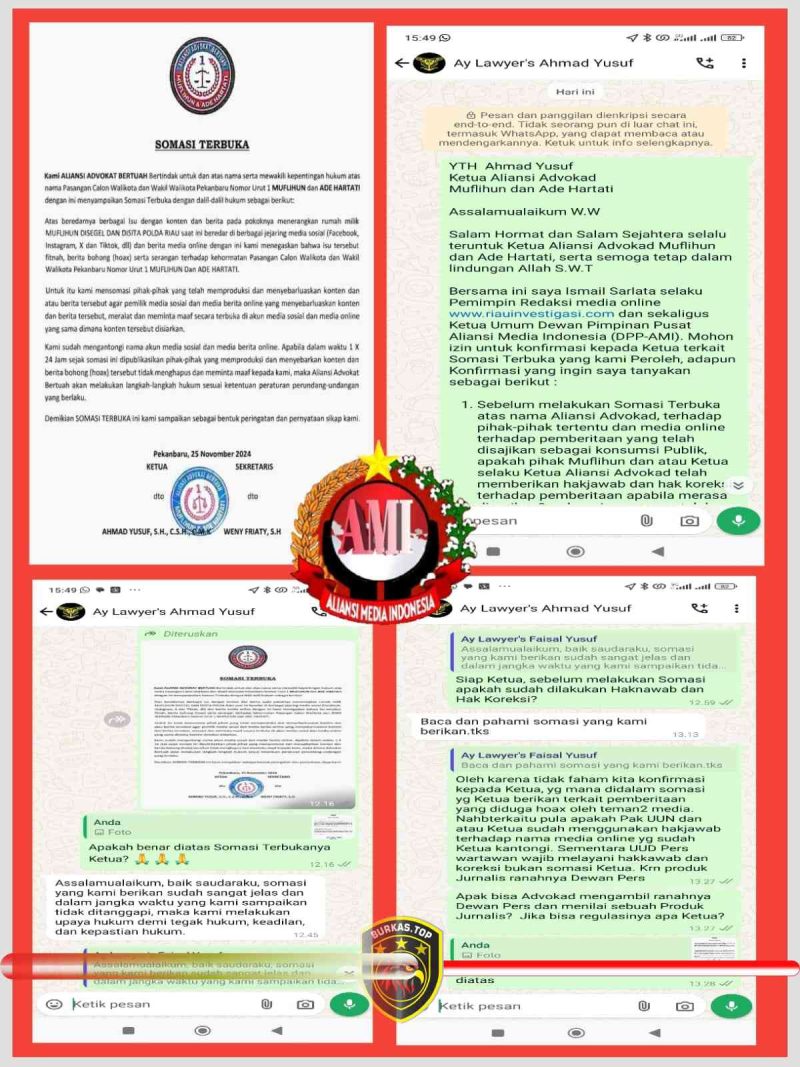 Burkas top –PEKANBARU —- Memasuki hari tenang pelaksanaan Pemilukada serentak 2024, dunia Pers dihebohkan adanya Somasi Terbuka yang yang ditujukan kepada Pers dan diperoleh Insan Pers yang ada di Pekanbaru Provinsi Riau dari seseorang dan atau sekelompok orang yang mengaku dan atau bertindak sebagai Aliansi Advokat Bertuah (Muflihun dan Ade Hartati).