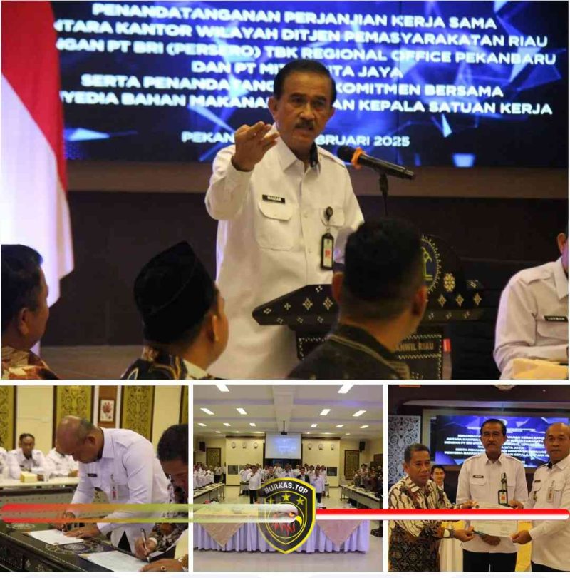 Burkas top  –Pekanbaru, – Sebagai salah satu wujud Lembaga Pemasyarakatan (Lapas) Kelas IIA Pekanbaru terus berkomitmen meningkatkan pelayanan dan pemenuhan hak bagi warga binaan, Kepala Lapas Pekanbaru, Erwin Fransiskus Simangunsong, mengikuti rangkaian kegiatan penandatanganan Memorandum of Understanding (MoU) di Kantor Wilayah (Kanwil) Direktorat Jenderal Pemasyarakatan (Ditjenpas) Riau, Senin (03/02/2025).