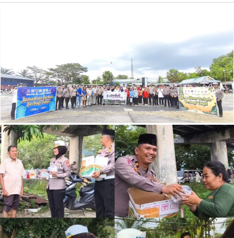 Burkas top –Pekanbaru— Direktorat Lalu Lintas (Ditlantas) Polda Riau bersama Istansi terkait Maen Dealer dan Mahasiswa Riau berkolaborasi dengan melakukan kegiatan sosial dengan berbagi Paket Takjil kepada masyarakat yang terdampak banjir luapan air sungai Siak.