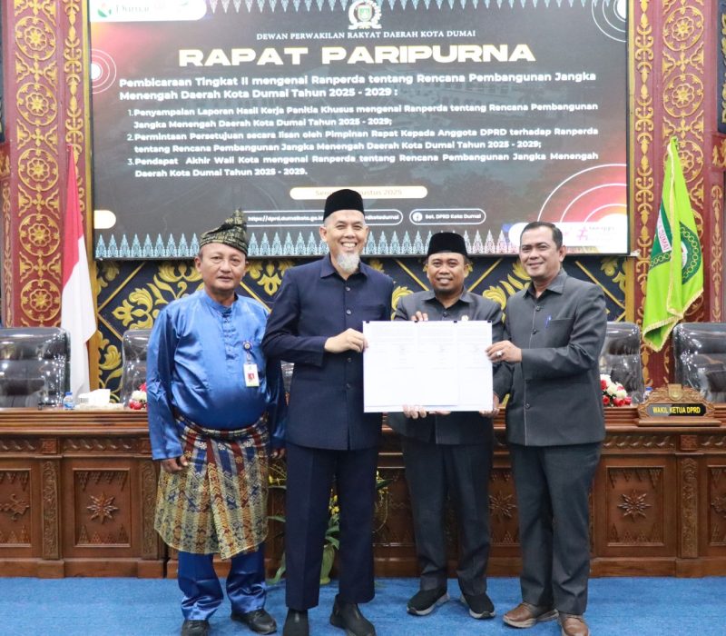 BURKAS.TOP, DUMAI |– Pemerintah Kota (Pemko) Dumai kini memiliki landasan hukum yang kuat untuk melaksanakan program pembangunan lima tahun ke depan. Hal ini menyusul disahkannya Rancangan Peraturan Daerah (Ranperda) tentang Rencana Pembangunan Jangka Menengah Daerah (RPJMD) Kota Dumai tahun 2025-2029.